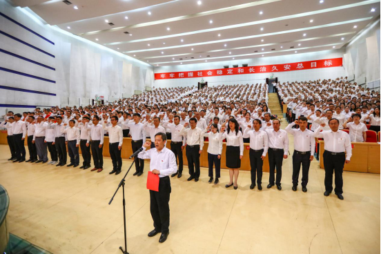 大会在雄壮的国歌声中开始,校领导为新发展党员佩戴党徽,大学党委副书记罗旭带领新发展党员宣誓、老党员重温入党誓词,全体党员面向党旗庄严宣誓。