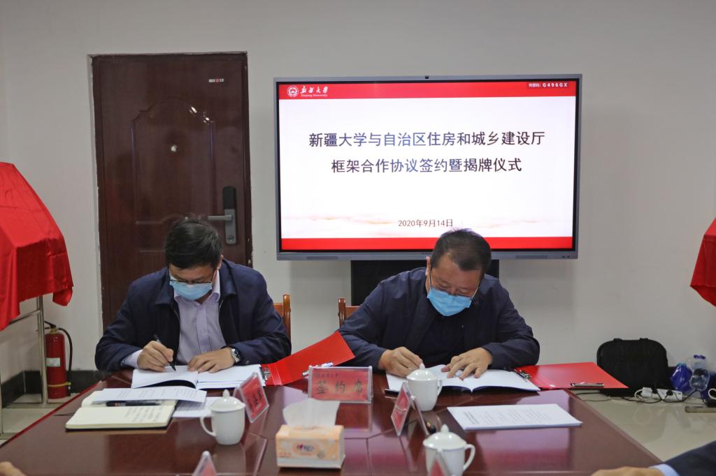 9月14日上午,beat365正版唯一官网与自治区住房和城乡建设厅框架合作协议签约暨揭牌仪式在beat365正版唯一官网南校区举行。自治区住房和城乡建设厅党组副书记、厅长李宏斌,党组成员、副厅长李林毓,一级巡视员徐彬,beat365正版唯一官网党委书记许咸宜,校党委常委、副校长蒋海军,校党委常委、组织(人事)部部长陈建平以及双方相关部门负责人参加了签约暨揭牌仪式。