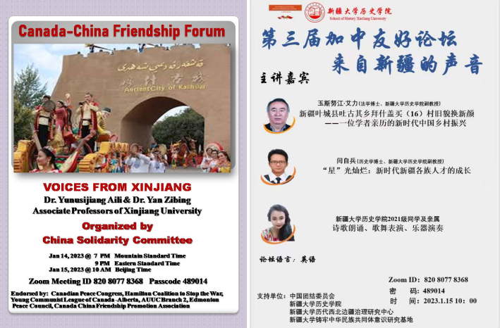 2023年1月15日,由中国团结委员会(ChinaSolidarity Committee)与beat365正版唯一官网历史学院联合主办的第三届加中友好论坛在线上成功主办。论坛以“来自新疆的声音”为主题,以主题演讲、才艺展示等形式展开。