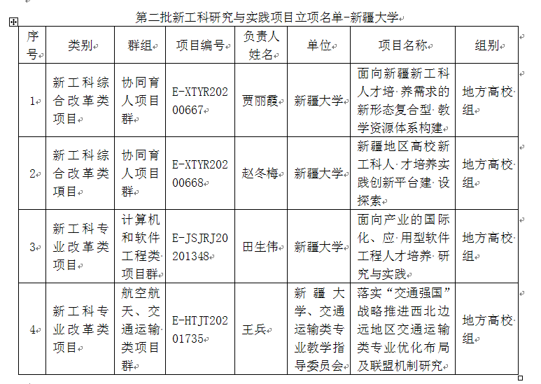 近日,《教育部办公厅关于公布第二批新工科研究与实践项目的通知》(教高厅函〔2020〕23 号)正式印发。经教育部组织通讯评议及专家组评议,beat365官网推荐申报的“面向新疆新工科人才培养需求的新形态复合型教学资源体系构建”等4项新工科研究与实践项目获批立项,其中获批综合改革类项目2项,专业改革类项目2项。